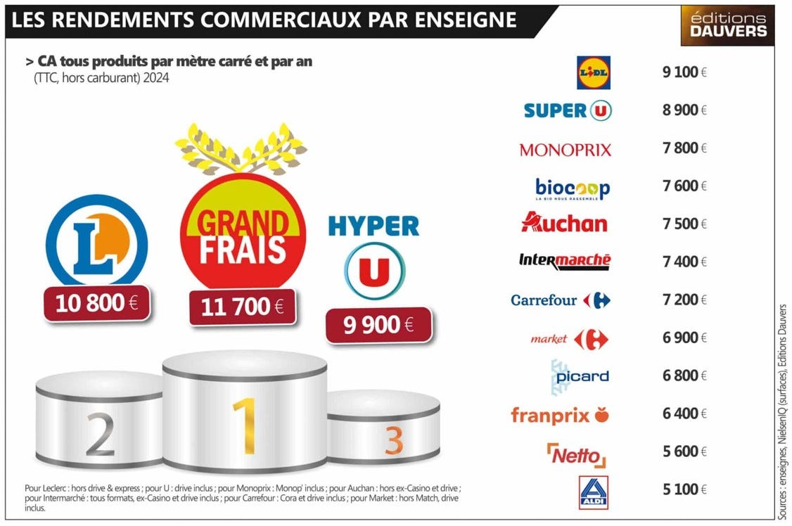 “Ce format, volontairement resserré, se traduit par un rendement impressionnant. Dans son étude annuelle sur le rendement commercial des enseignes, l’expert de la consommation classe Grand Frais très largement en tête au niveau national, avec 11 700 euros de ventes annuelles par mètre carré. L’enseigne devance ainsi nettement Leclerc (10 800 euros), Hyper U (9 900 euros), Lidl (9 100 euros) ou encore Intermarché (7 400 euros).”